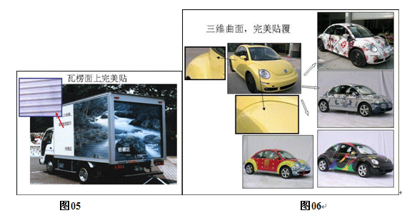 优异的延展性,在带有铆钉的车身表面,瓦楞面以及三维曲面实现完美贴覆,如图05~06。