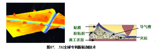 众所周知,压敏胶类贴膜材料的施工,尤其是对于大画面的施工,最大的困难就是画面的对位与施工过程中产生气泡。IJ180C系列贴膜应用了3M全球专利的胶黏剂技术Controtac(用于定位的微观凸起)配合Comply(导气槽)技术,如图07,解决了上述困难, 并使得IJ180系列在施工方便及性能上具有极大地优势: